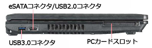 左端から、スピーカー/マイク、USB2.0 2個、HDDを取り付けた変換マウンタ