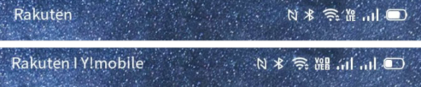 SIMを2枚セットすると、スマホのロック画面の上端が下側の画像のようにRakuten の横に Y!mobile の表示が加わり、右端のアンテナが増えます