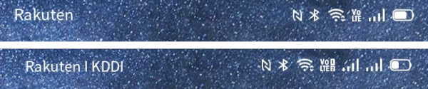 SIMを2枚セットすると、スマホのロック画面の上端が下側の画像のようにRakuten の横に KDDI の表示が加わり、右端のアンテナが増えます