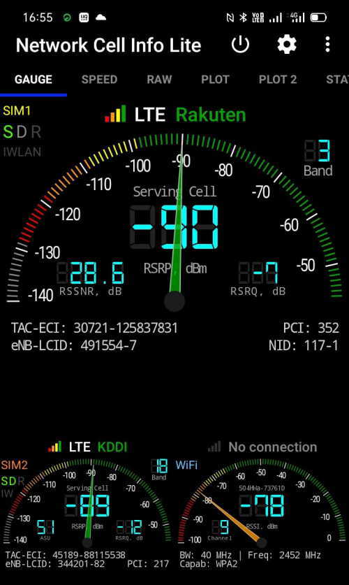 しかし、楽天の電波が弱く自宅では圏外となり、SIM1の楽天の信号が無くなった時の画像を参考に残しました。
