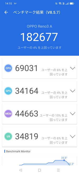 - ベンチマークのAnTuTuデータが 184,000程度あり、標準的なミドルレンジのスマホとなっている