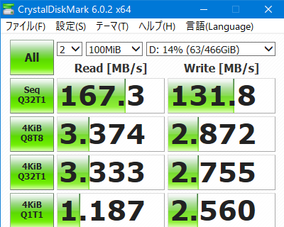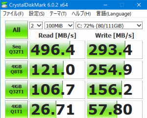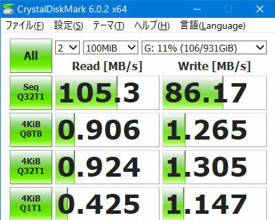 2016年にCrystalDiskMarkで測定したものなので、バージョンアップで測定方法や表示が変わる可能性があります。