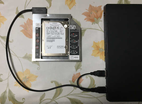HDDを光学ドライブ変換マウンタに取り付け、ノートパソコンに内蔵して測定