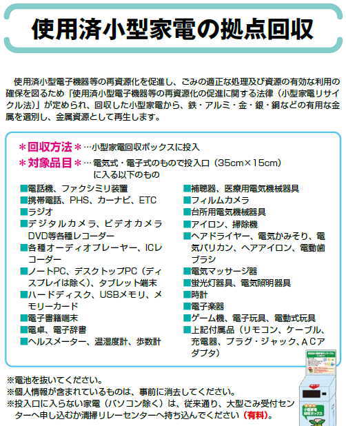 市町村により回収方法が異なると思いますが、わが町では十数か所に設置された「小型家電回収ボックス」に投入するようになっています。