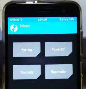 TWRP の起動の確認が出来たら、Reboot(再起動) → System(システム) を実行し、スマホを通常起動します。