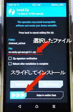 - インストール -> No verity をタップ -> 下段の「Swipe to confirm Flash」をスライドしてインストールします
