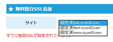 赤い矢印をクリックすると、SSLの追加が出来る登録されているサイトの一覧が表示されるので、設定したいサイト www.syumi3.com を選択し追加設定します。