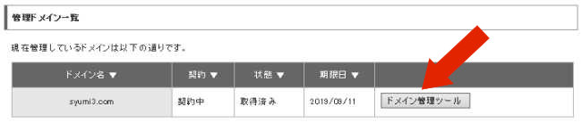 「管理ドメイン一覧」の「ドメイン管理ツール」をクリックします。