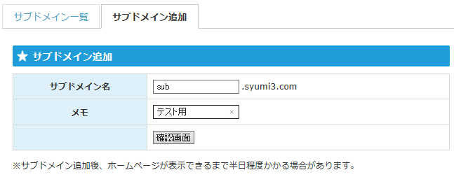 サブドメイン名とメモを入力し確認画面を表示した後追加決定します。