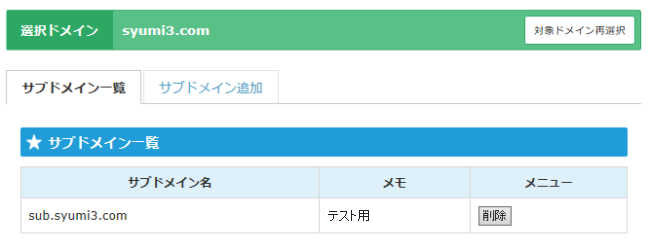 サブドメイン名の欄に、sub.syumi3.com が追加表示されます。
