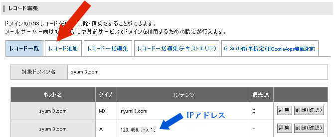 「コンテンツ」の欄には、上記画像にある対象ドメイン(この例ではsyumi3.com)の「コンテンツ」の欄の IPアドレス と同じものを入力します。
