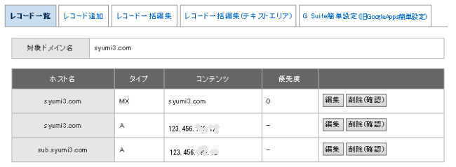 使用出来るようにするためには次の手順の「DNSレコード編集」を実行します。