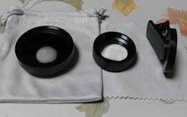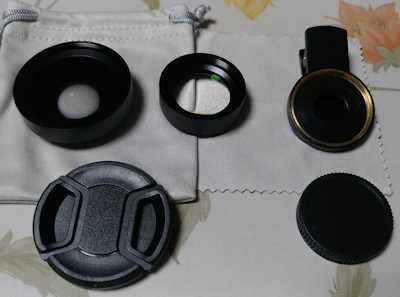 レンズ部分を離してみました。 左の上から、広角レンズ、マクロレンズ、クリップ 広角用とクリップ用の保護キャップ |