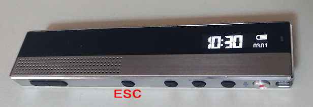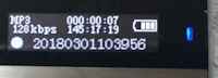 ボタン1を2秒以上長押しすると、「しばらくお待ちください」と表示された後、青いLEDが点灯し録音が始まります。 FMラジオや音楽を聴いていても、中断し録音が始まります。 現在日時と時刻がファイル名となります。(例 20180301103956)