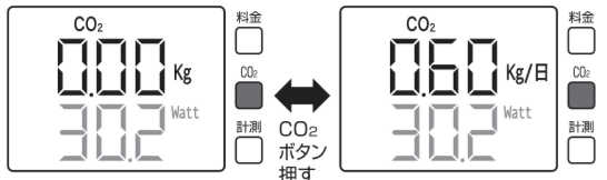 CO2ボタンを押すとCO2排出量の積算と一日あたりの排出量が切替えて表示されます。