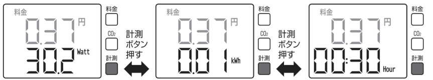 計測ボタンを押すとWatt(消費電力)→ kWh(積算電力量)→ Hour(便い始めてからの合計時間)の順に表示が変わります。