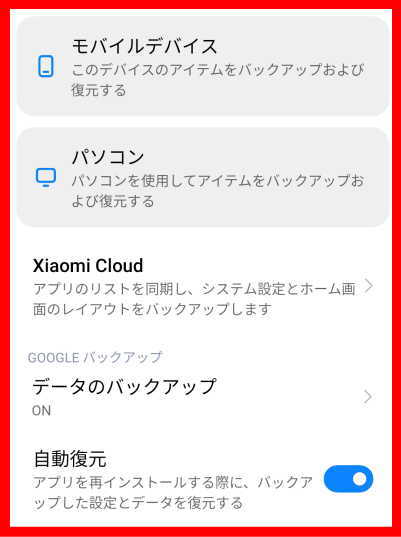 スマホ自身にバックアップと復元の機能があります。