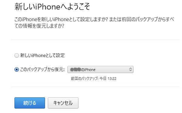 - iTunesに「新しいiPhoneへようこそ」の画面がでますので、3. の手順で実施したバックアップを選択して、この「バックアップから復元」をチェックし「続ける」で、ほぼ元の状態に復元されます。