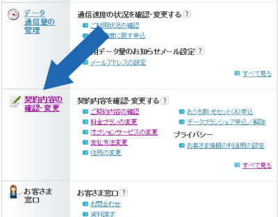 パソコン画面中段の「契約内容の確認・変更」をクリック