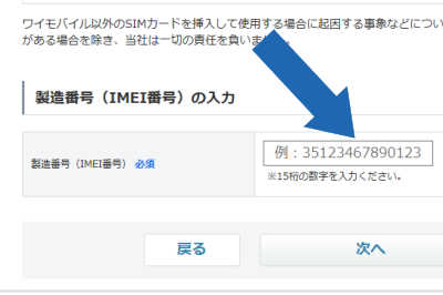- 「SIMロック解除の手続き」の説明文の最後に、「製造番号(IMEI)の入力」の画面があるので、事前準備でメモしておいた 15桁の製造番号(IMEI)を入力し「次へ」