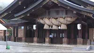 鳥取県出雲市の出雲大社 出雲大社は大屋根の修復中なので、この画像の後ろは大きな囲いで覆われておりました。 2年後の(2013年)平成25年5月10日には麗しく甦った御本殿に大神さまがお還りになられる「本殿遷座祭」を斎行予定だそうです。 天気が悪いのに観光バスや乗用車でたくさんの方が来られていた。 |