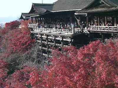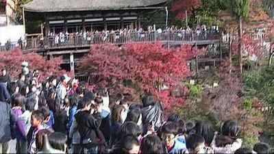 平日なのでゆっくり紅葉が楽しめるだろうと思いきや、清水の舞台は 中学や高校の修学旅行らしき集団、 町内会の団体さん、 海外の団体さん、 その他大勢の人でにぎわっていた。 |