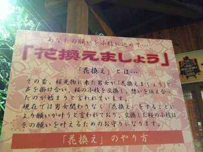 | 桜見物に訪れた男女が「花換えましょう」と声をかけあい、 桜の小枝を交換することで思いを伝えたといわれる、ロマンチックなお祭りです。 「花換え」をしたカップルは将来幸せに恵まれるといわれています。 |