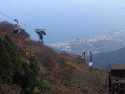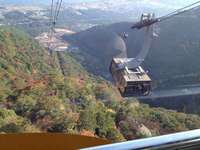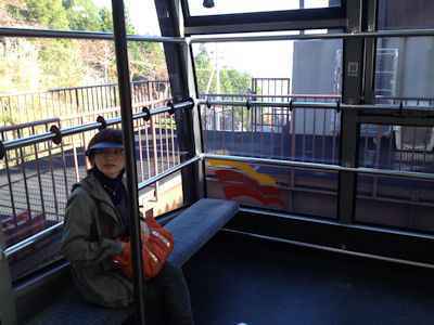 | ここのロープウエイは日本一の速さで、 標高1,100mの山頂まで4分で行く。 紅葉を楽しむ時期は山頂まで7分の速度で移動。 121人乗りの大型でゆったりとした広さ。 1時間に3本運行しているようです。 平日の午後なので我々を含め4名。 到着までガイドさんが案内してくれる。 |