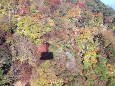 天気が良いので自分が乗っている ロープウエイの影がくっきりと 紅葉の中に浮かんでいた。 |