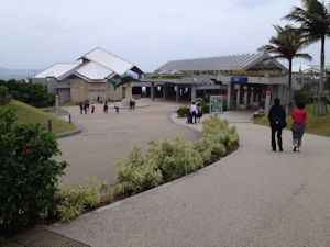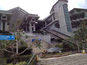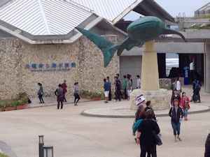 | 駐車場から「美ら海水族館」(ちゅらうみ)に向かうと小さな建物が見え すごいスケールの水族館のイメージは無い。 4階建ての最上階が駐車場からの入口になっています。 |