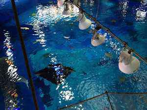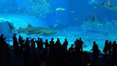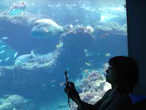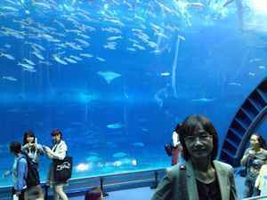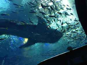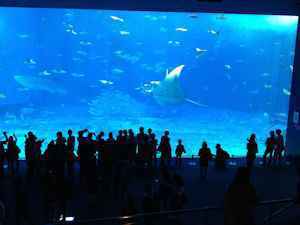 奥に進むと噂の巨大水槽が現れる。 7メートル前後あるらしいジンベイザメが 悠々と泳いでいる。 |