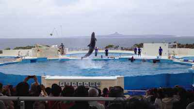 オキちゃん劇場では可愛いイルカ達が 愛嬌を振りまき拍手喝采。 |