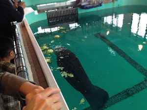 マナティー館では、人魚伝説のモデルといわれている マナティーがキャベツを丸ごと 抱きかかえるようにして上手に食べていた。 |