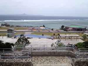 駐車場から建物の奥まで進むと 沖縄の海が全面に広がる。 |