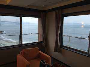 | 海に面した角部屋でした | 窓を開けると大鳴門橋が見えます | 赤い手すりの建物の向こうに 大塚国際美術館があります |