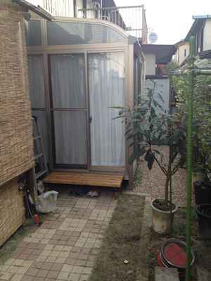 三協立山アルミの サンルーム「晴れもようⅢ」 約2.7m×2.7m の4畳半相当のタイプを設置した。