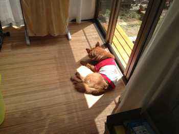 サンルームが大きく場所をとったのでだいぶ狭くなったが何とかなりそうだ。 今日は外に出ると風があり少し肌寒い感じだが、サンルームはポカポカ。 ワン公達は昼寝場所が出来たので大いに利用している。 |