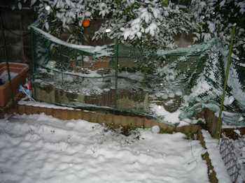 | 裏の庭は5cmほどの積雪で、デコポンの枝が垂れ下がっていましたが、 黄色い実がくっきりと浮かび上がっていました |