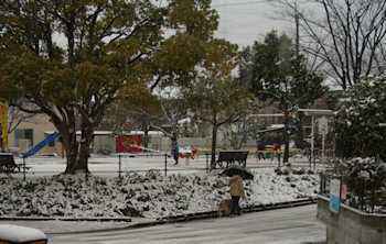 | 表の道は真っ白で、車での移動はやばそう! | 翌朝外に出てみると、 すぐ横の公園では、子供たちがはしゃいでいました。 |