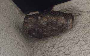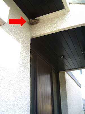 玄関の横に足長蜂の大きな巣がある。 夏場から気が付いていたが攻撃性は無いらしいので そのままにしておいた。 徐々に大きくなり現在は横幅が20cmぐらいになっている。 冬になると蜂がいなくなるらしいのでその後除去する。 |