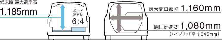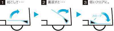 | 右図の様に荷室のフロア反転ボードを 裏返すとさらに低いフロアとなり 背の高いものが積みやすくなる。 |