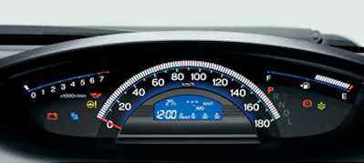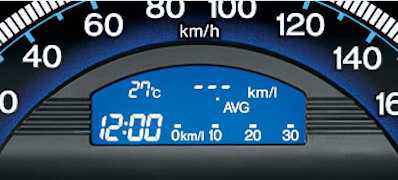 メーターには、外気温度、平均燃費、瞬間燃費(0.5秒毎)などが表示される。 |