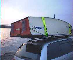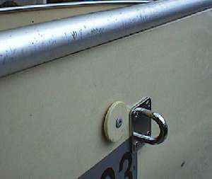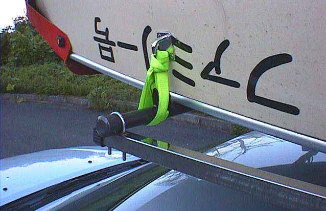 もっと簡単に固定するために、ボートの側面の前後にベルトをかけるフックを4個取りつけ、ここにベルトを通しキャリアと固定すれば前後のずれの心配も無い。(これは 気ままな「海のボート釣り」を開いておられるNonoさんの固定方法を参考にさせて頂きました。)