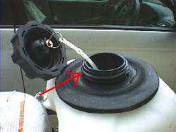 この様な状態が数回続いてよくよく調べると、タンクの矢印の所のネジ山がはがれネジが馬鹿になっていた。蓋がしっかり締まらないのでガソリンが少しずつしみ出ていたようだ。