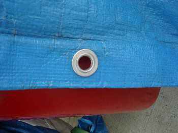ゴムひもとフックの取り付け場所にハトメを取り付けボートにセットしてみた。