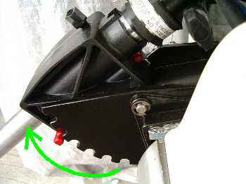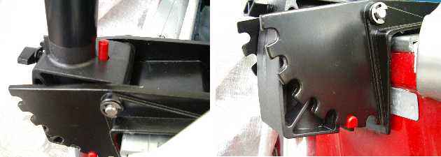 左の画像の赤い出っ張りを指で押し込むと、右側画像の下の赤いロック部分が下方に下がり左上に向かって刻まれている切込みの一番上にセットするとチルトアップされた位置になる。