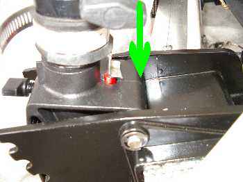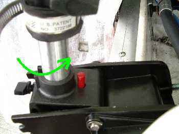 この位置で本体を降ろすと、本体の重量だけで赤いノブを押し下げてくれる。