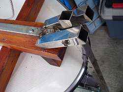 右端の画像を見ればわかるが、回転した角パイプはベースの角パイプの頭にアタリ回転が止まる。止まる位置は差し舵の角パイプがボートの先端に当たらない位置である。画像でわかると思うがボートの先端と約1cmの隙間が空くようになっている。