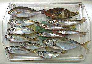 生きた豆アジを現場で確保。キス用にゴカイ。 |