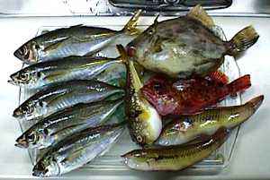 アジ 22~24cm5匹、カワハギ 23cm、ガシラ 19cm、ベラ ~19cm2匹、フグ 18cm |